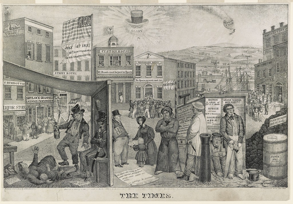 Given the call of the Jacksonian Democrats for gold rather than paper money, one might view with some irony the results of President Jackson’s opposition to rechartering the Bank of the United States. Without the federal bank, numerous private banks were established, each one of which issued its own paper money and certificates of exchange. Many historians believe that the glut of paper money and ensuing inflation was one cause of the Panic of 1837 (along with wild speculation, risky lending practices, and a drying up of British and European credit). This was the worst financial crisis of the 19th century, lasting seven years, with unemployment reaching 10 percent.