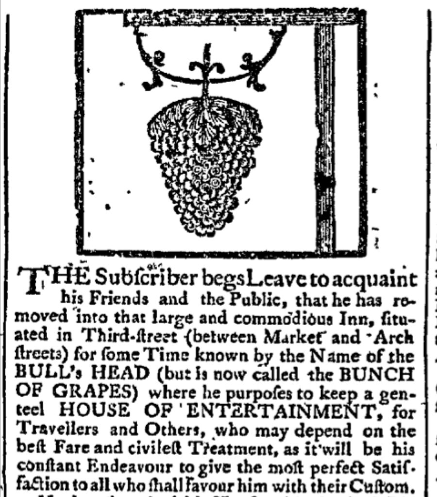 The tavern began operation in the middle of the eighteenth century under the sign of the Bull’s Head. In 1767, it was purchased by the super-wealthy businessman William Bingham. The following year, Josiah F. Davenport rented the premises and renamed it the Bunch of Grapes. Davenport advertised in May 1768 that he “proposes to keep a genteel HOUSE OF ENTERTAINMENT, for Travellers and Others, who may depend on the best Fare and civilest Treatment, as it will be his constant Endeavour to give the most perfect Satisfaction to all who shall favour him with their Custom.” He noted that the building “has the Advantage of an elegant and spacious Room for the Accommodation of large Companies, who may have Occasion to meet on Business or Recreation” (Pennsylvania Gazette, June 6, 1768).