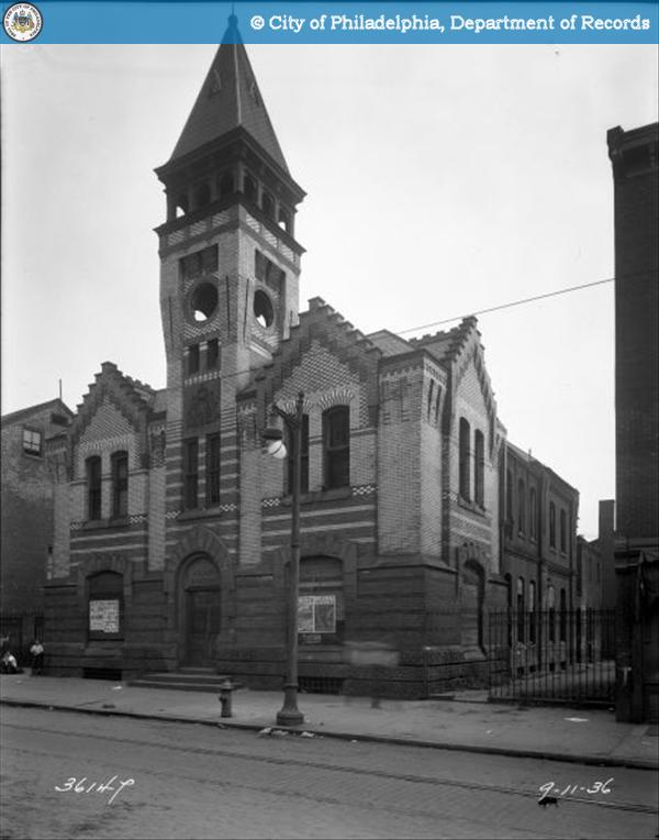 (6) The Southwark Commissioners’ Hall (Town Hall), a brick building with a white cupola, used to face Second Street and straddle Beck Street (between Christian and Queen Streets. It was replaced in the last decades of the 19th century by a taller Victorian-styled building, which later was converted into a district police station. That building was pulled down in the 1930s, and most the land was given to a gasoline station. About 40 years ago, that was in turn replaced by a row of one-story shops with a parking lot in front. Recently, a handsome four-story apartment house was constructed on the lot, while on the other side of Beck Street, there is a small park.