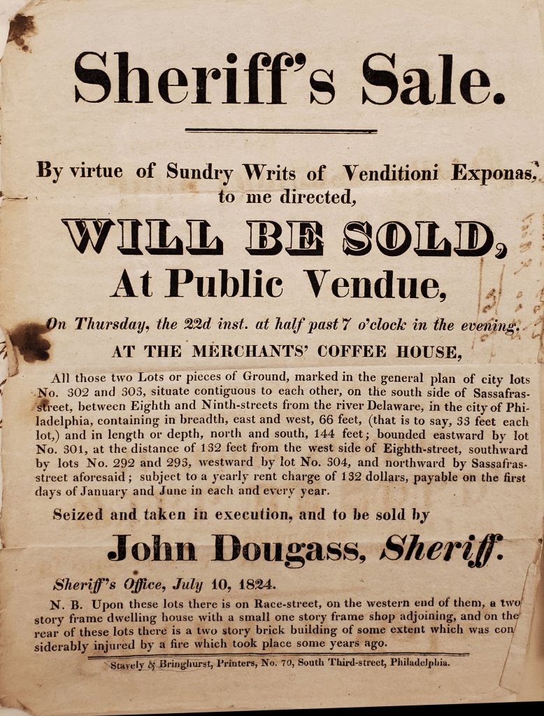 Around the time the Douglass took office, Philadelphia and the country were slowly recovering from the effects of the Panic of 1819—the first widespread economic depression in the United States. In that atmosphere of economic uncertainty, general consternation was being expressed in Philadelphia against the frequent sheriff’s sales, in which people in arrears for rent payments were being dispossessed of their homes. In fact, Governor Joseph Heister had campaigned for office on the promise to reduce the number of sheriff’s sales.